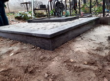 Когда подготовительные работы на территории могилы были завершены, мы принялись за укладку брусчатки на пескобетон, сама плитка была уложена вровень с облицованным гранитными плитами цоколем. Параллельно с этим мы подготовили основание для последующей установки надгробья.
